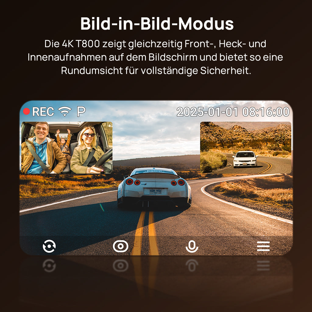 Bild-in-bild-modus: auf dem bildschirm der 4K T800 werden gleichzeitig front-, heck- und innenaufnahmen angezeigt, sodass sie eine allumfassende, aus mehreren blickwinkeln aufgenommene ansicht der umgebung ihres fahrzeugs erhalten – für absolute sicherheit.