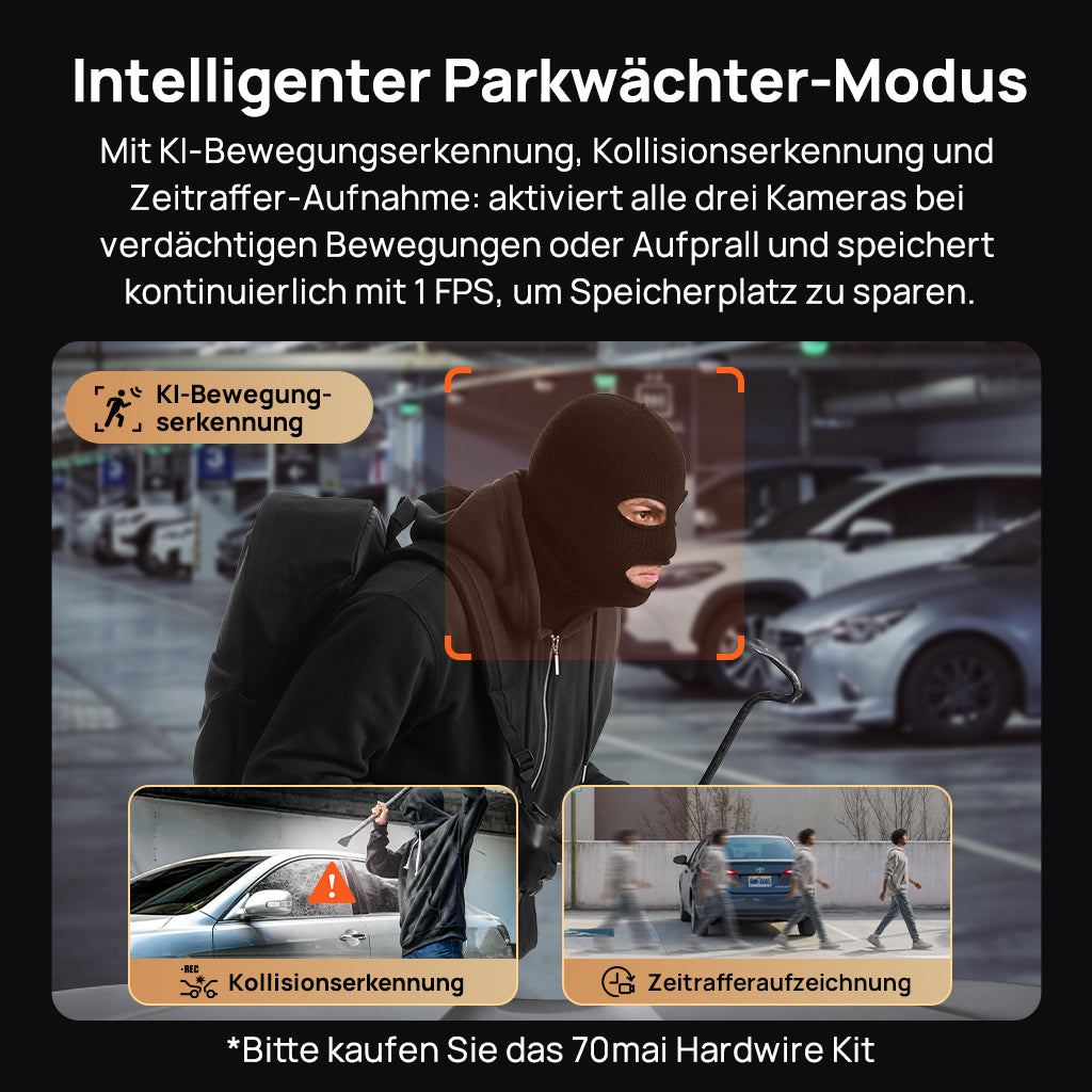 Intelligenter parkwächter-modus*: Verfügt über KI-Bewegungserkennung, Kollisionserkennung und Zeitraffer-Aufnahme, die alle drei Kameras zur Aufzeichnung verdächtiger Aktivitäten oder Kollisionen auslösen, während kontinuierliche Aufnahmen mit 1 FPS erfasst werden, um Speicherplatz zu sparen. (*Das 70mai Hardwire Kit ist erforderlich und separat erhältlich.)
