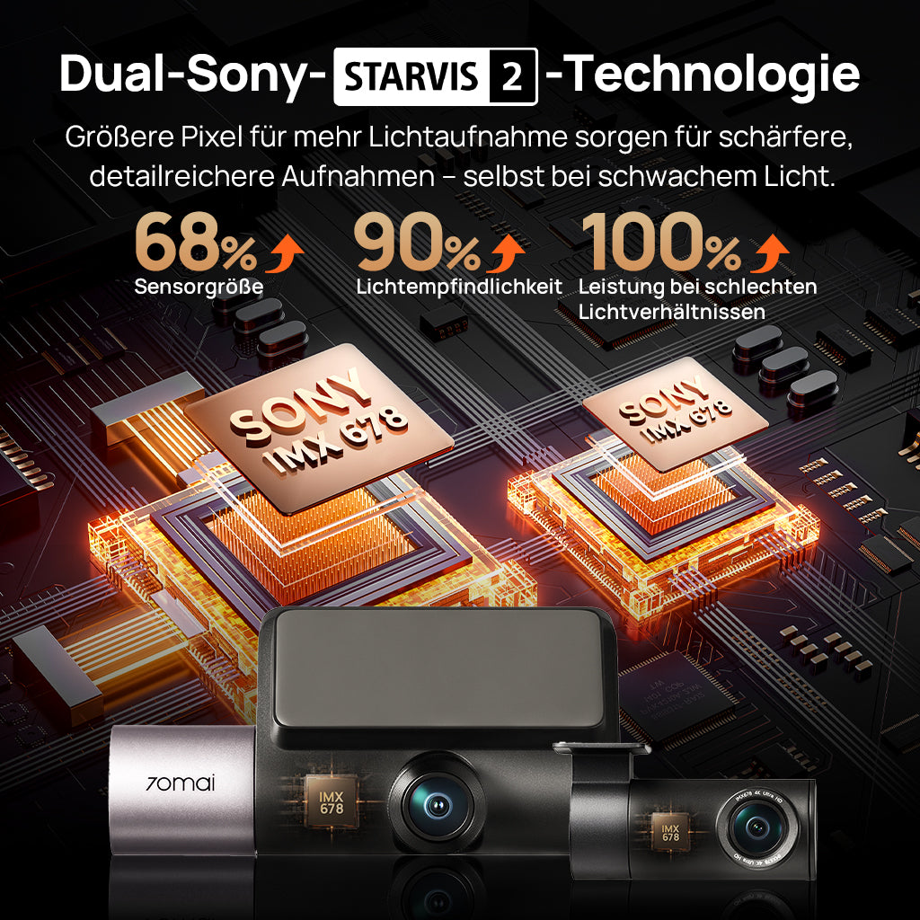 70mai Night Owl Vision™: 70mai's exklusive Technologie, die klarere Nachtbilder mit weniger Rauschen, ausgewogener Belichtung und verbesserter Blendungsreduzierung erzeugt.