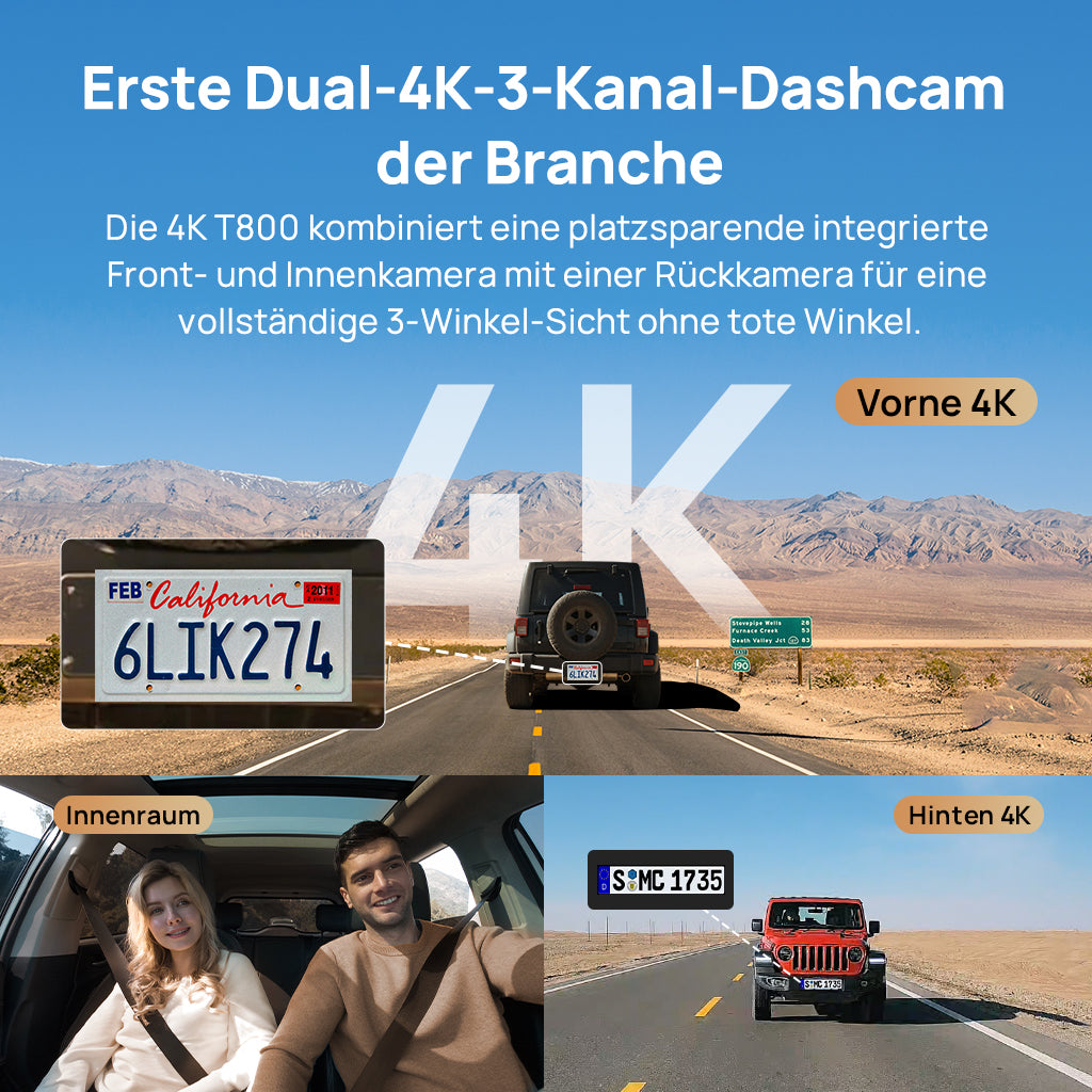 Entdecken sie mit der 4K T800 überragenden schutz beim fahren. sie ist die erste dreikanal-dashcam der branche mit doppelter 4k-aufzeichnung (vorne/hinten) und 1080p-innenraumabdeckung. dank ihres integrierten designs spart sie platz. mit einer rückfahrkamera bietet sie umfassende dreifachansichten, um tote winkel zu minimieren.