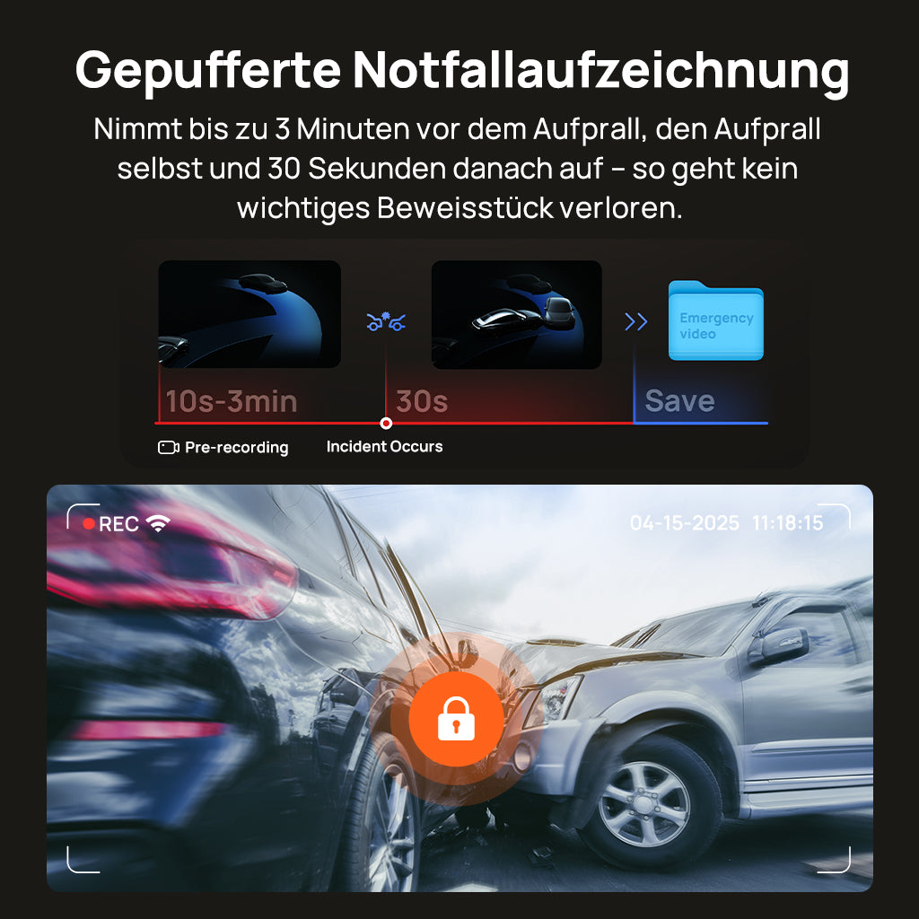 Gepufferte notfallaufzeichnung: bei einem plötzlichen aufprall oder notfall werden bis zu 3 minuten vor der kollision, der aufprall selbst und 30 sekunden danach aufgezeichnet, sodass keine wichtigen beweise verloren gehen.