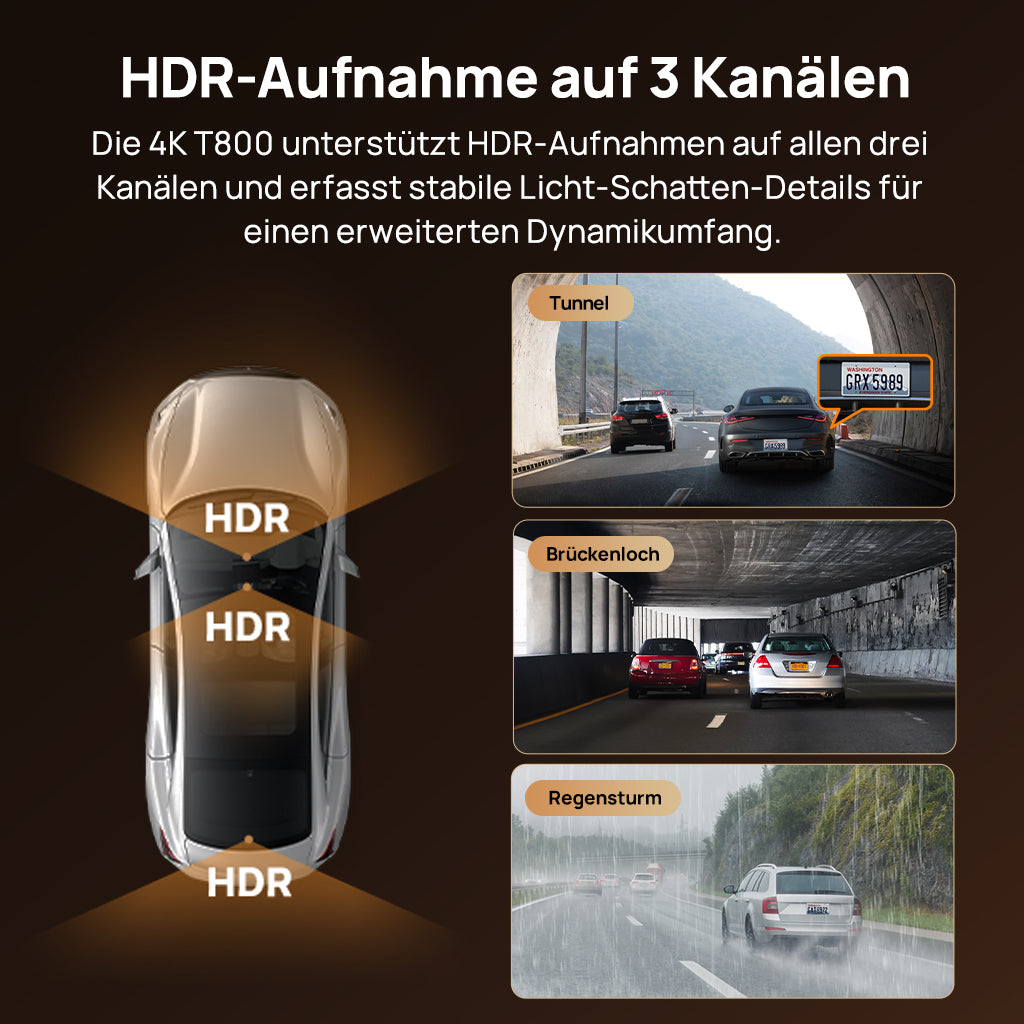 Die 4K T800 ermöglicht eine hdr-aufzeichnung auf allen drei kanälen. sie erfasst zuverlässig details in den lichtern und schatten, wodurch sich ein erweiterter dynamikumfang ergibt. so liefert sie bei allen lichtverhältnissen – von bewölkten tagen bis hin zu tunneln – atemberaubende, lebendige bilder.
