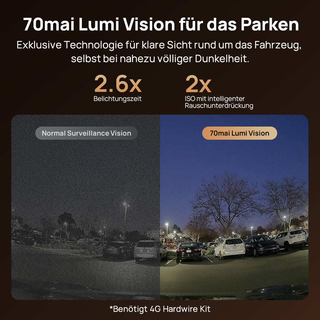 70mai Lumi Vision für das parken: auch bei fast völliger dunkelheit sorgt diese branchenweit einzigartige technologie für klare sicht rund um das fahrzeug.
