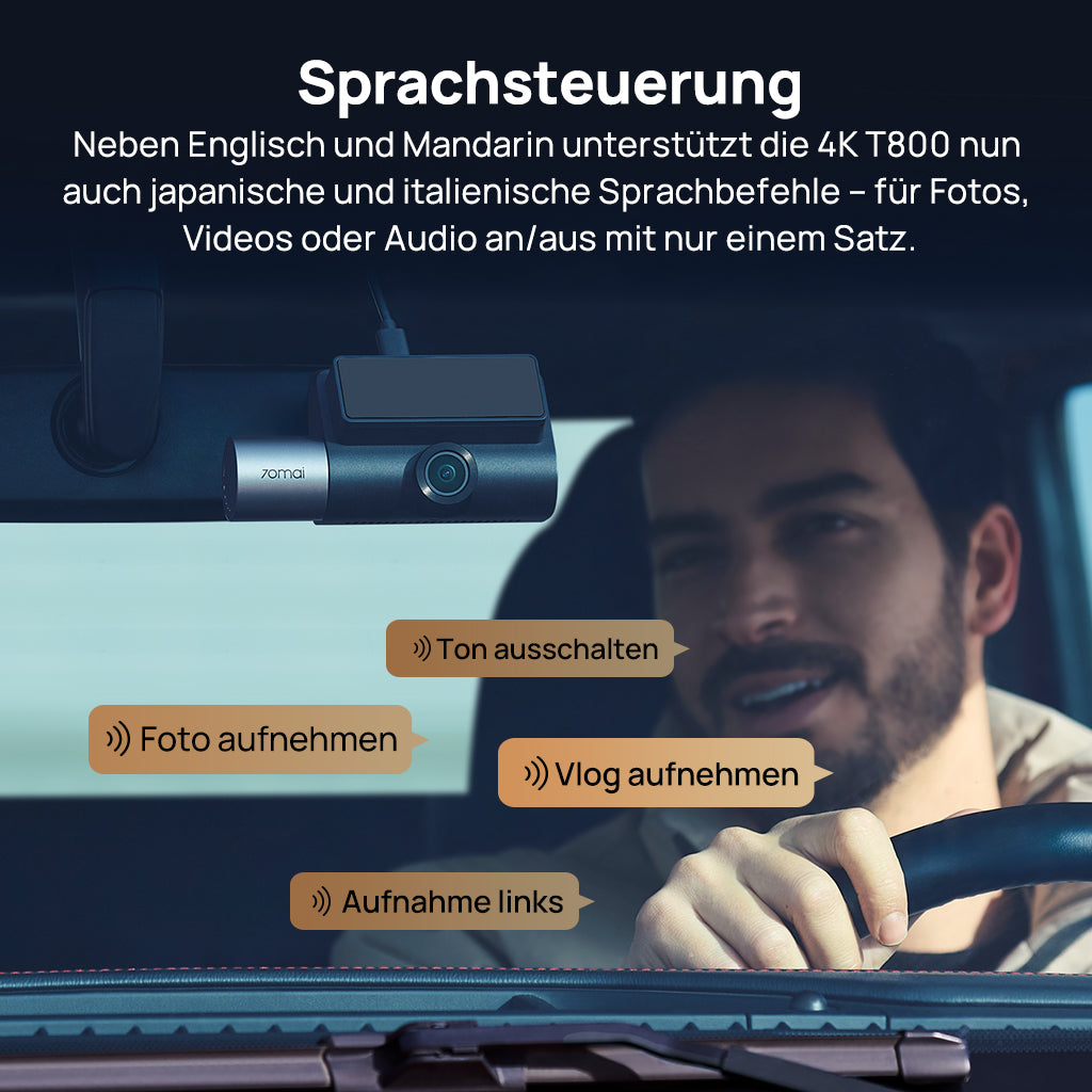 Sprachsteuerung: neben englisch und mandarin unterstützt die 4K T800 nun auch japanisch und italienisch. verwenden sie einfache befehle, um fotos/videos aufzunehmen oder audio ein- bzw. auszuschalten.