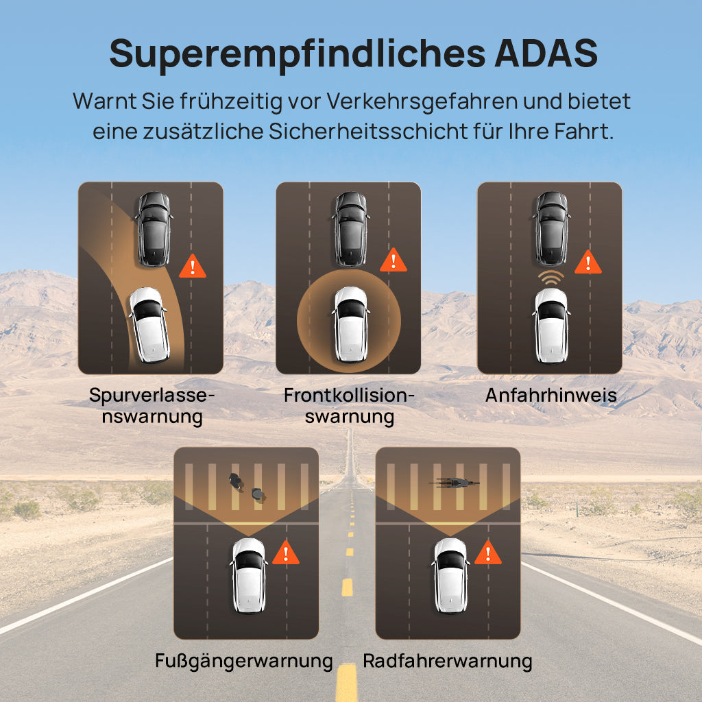 Die 4k a800se ist mit einem 5-modi-adas-system ausgestattet und minimiert aktiv gefahren im straßenverkehr. vor spurverlassens, auffahrenden fahrzeugen und frontalkollisionen wird frühzeitig gewarnt und für zusätzliche sicherheit auf ihrer reise wird nun eine fußgänger- und radfahrererkennung zur verfügung gestellt.