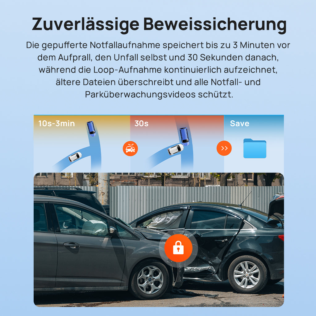 - Zuverlässige beweissicherung hinter dem lenkrad: während die loop-aufzeichnung kontinuierlich aufzeichnet und alte dateien überschreibt, zeichnet die gepufferte notfallaufzeichnung bis zu 3 minuten vor der kollision, den aufprall und 30 sekunden nach der kollision auf. dabei werden alle notfall- und parküberwachungsvideos geschützt.