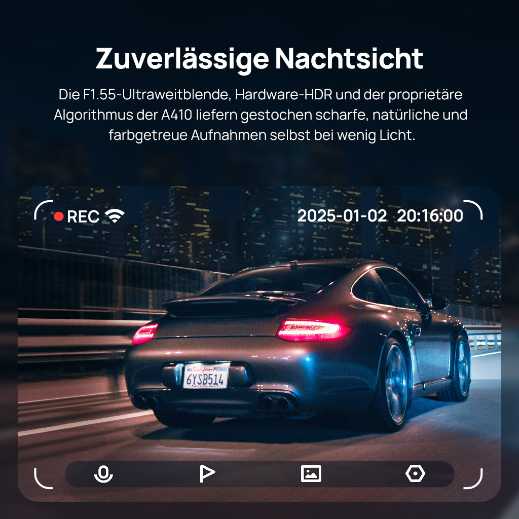 Die A410 liefert echte 2,5K-aufnahmen (2560 x 1440) vorne und 1080P hinten – ohne hochskalierung. die 2,5K-frontkamera hat 1,78-mal mehr details als 1080P. das sorgt dafür, dass man bei allen lichtverhältnissen scharfe bilder von wichtigen details wie kennzeichen und verkehrszeichen bekommt. dank dieser herausragenden bildschärfe können sie sich auf zuverlässige aufnahmen von vorne und hinten verlassen, wenn es um vorfälle wie spurwechseln, kollisionen und parkstreitigkeiten geht.