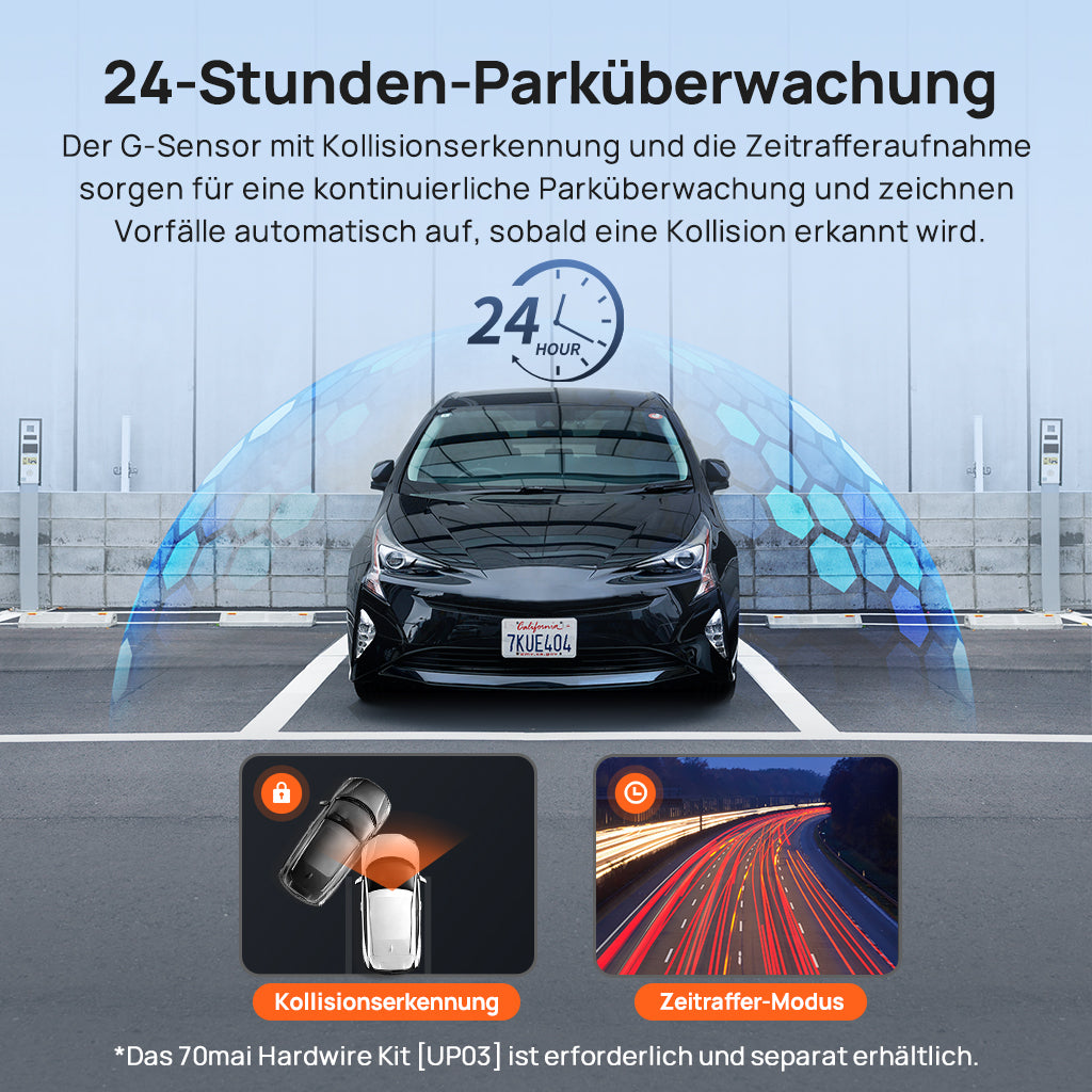 - 24-stunden-parküberwachung: dank g-sensor-kollisionserkennung und zeitrafferaufzeichnung erfolgt eine kontinuierliche parküberwachung und vorfälle werden automatisch aufgezeichnet, wenn eine kollision erkannt wird.